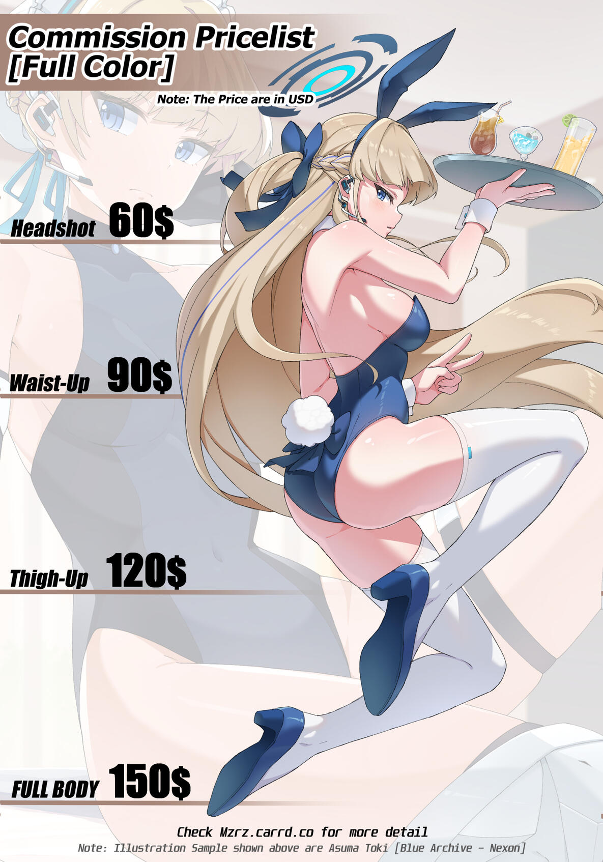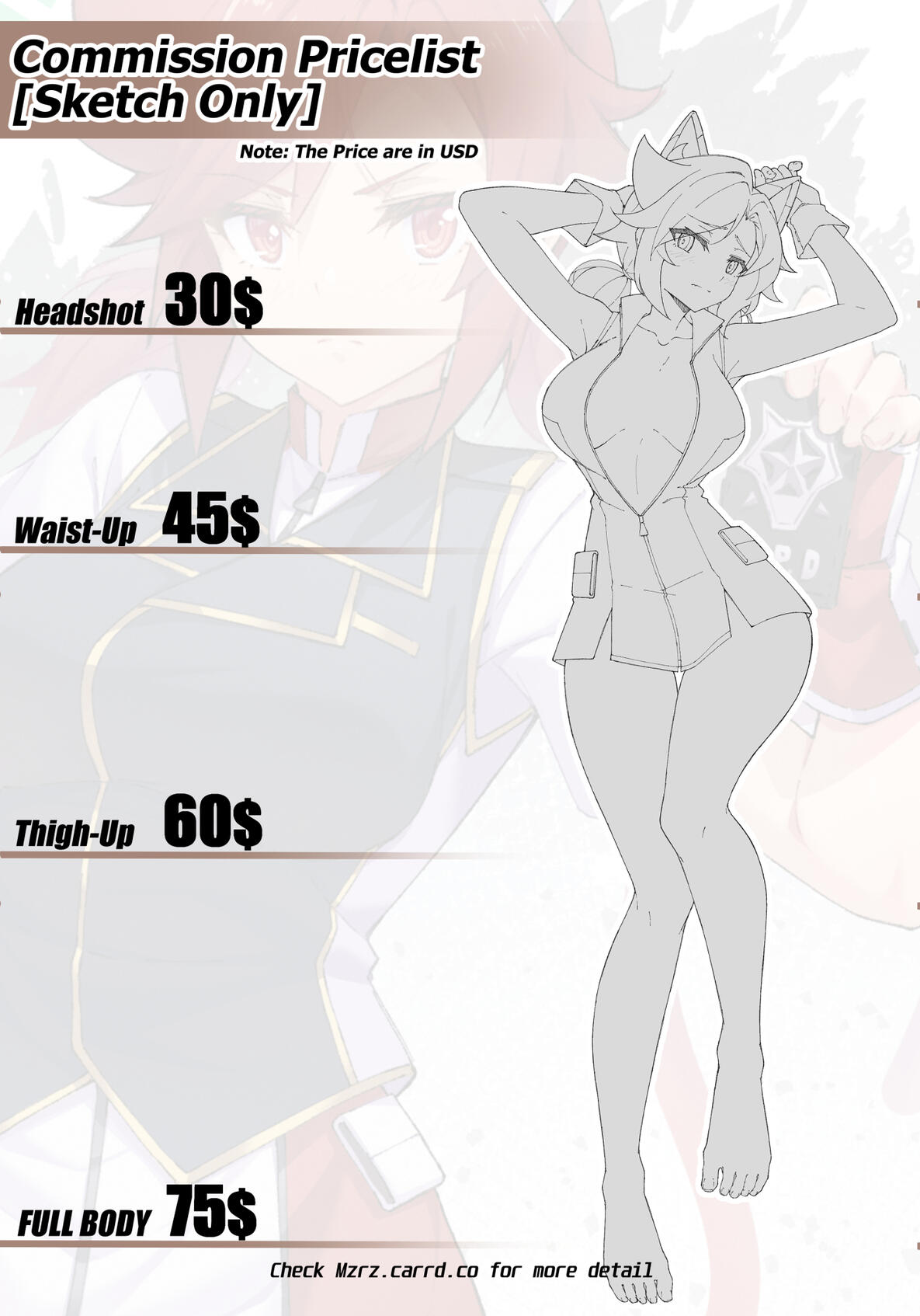Additional BG [Full Color] price Start at +20$ for the simple one (for example: Sky with Cloud), price increasing along with difficulty.Additional BG [Sketch Only] price Start at +10$ for the simple oneThis is the example of calculation for Full Body [Full Color]+Simple BG [Full Color] equal to 150+20=170$ total.Character with Complex detail like Armor, Ornament, Mechanic, Accesories, Weapon, etc. will have additional cost to them according to its difficultyThis price does NOT include designing a character from scratch/blank, the design need to be already available. if you need me to design a character there will be a separate Cost for it